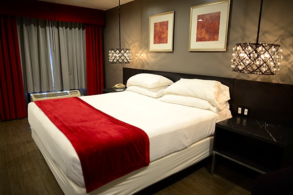 This suite features air conditioning, a wet bar, an upstairs private bedroom, and a two-person roman bathtub with his and her vanities. A 47-inch flat-screen TV, a microwave and a fireplace are included.